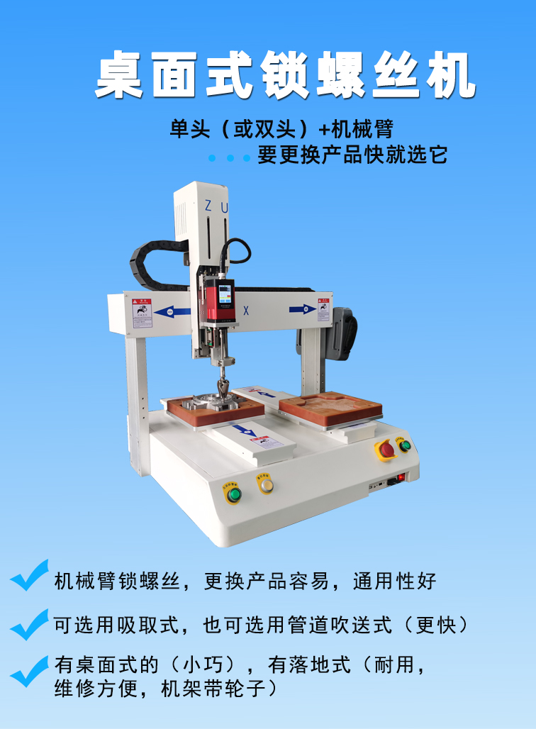 桌面型自動鎖螺絲機,主打是小規模半自動生產線。具有小型輕巧,可雙Y軸同步交替作業,提升生產效率;螺絲通用性好,通過更換螺絲送釘機或螺絲盒可實現通用M1.0~M4的螺絲,適合